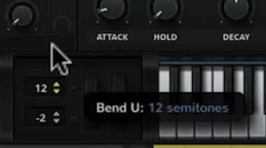 例えばSerumでは、画面左下にある数値を変更することにより、ピッチベンドで下げられる・上げられる最大範囲を決めることができます。