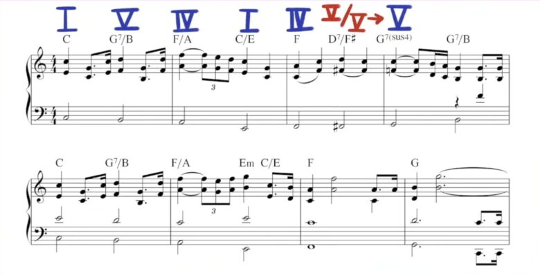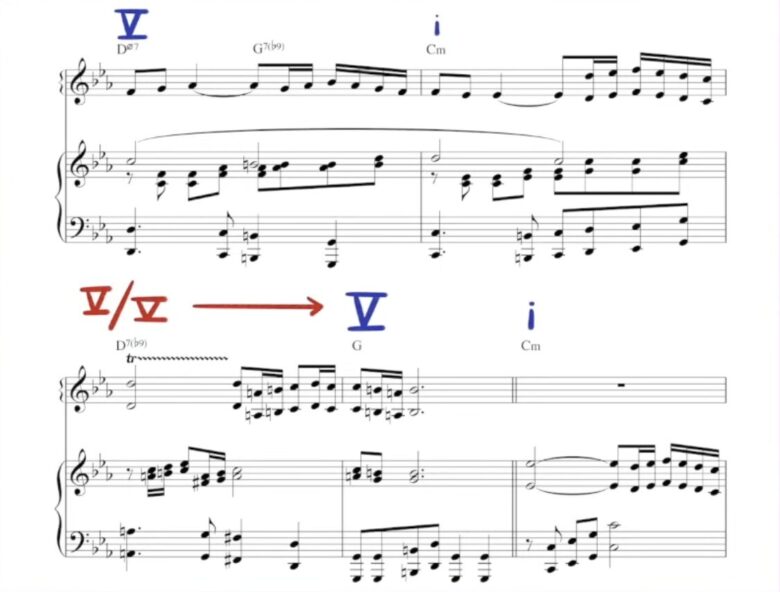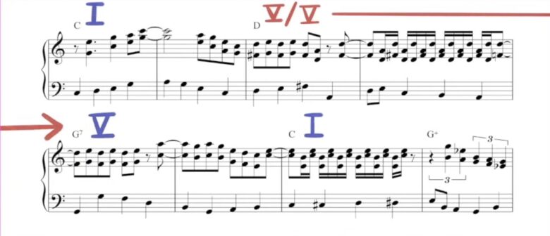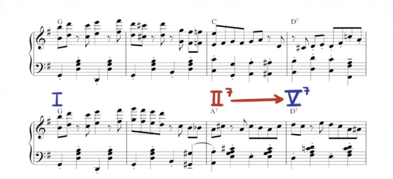 Vコードに対して使われるセカンダリードミナントは、ラグタイムやジャズ、クラシック音楽などでもよく見られるパターンです。