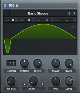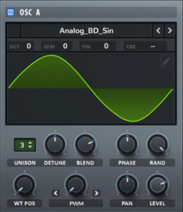 FMは「Frequency Modulation」の略で、もう片方のOSC(オシレーター)の信号を使って、ウェーブシェイプの周波数にモジュレーションをかけることができます。