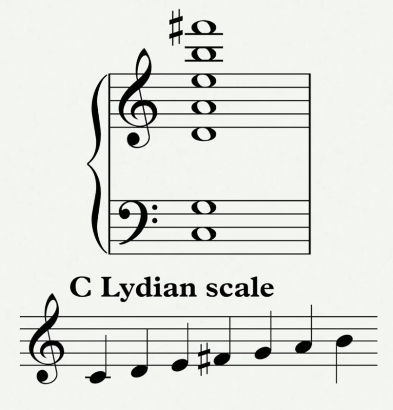 通常のメジャースケールの4thをシャープにしたもので、この#4の音がリディアンモードにおける「特徴音(リディアンモードらしさを出す音)」になります。