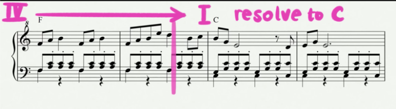 そのため、例えば上の画像のようにFリディアンモードらしい音使いをしていたとしても、最後はCメジャーキーのような終わり方で解決することがあります。