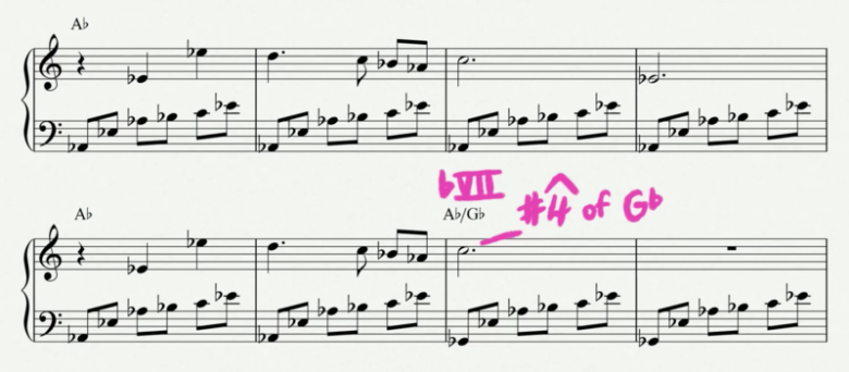この曲はAbリディアンモードで、トニックコードの上にリディアンモードを取り入れたメロディーを使い、異世界のような雰囲気を演出している素晴らしい例です。