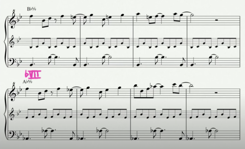 これまでご紹介した楽曲と少し違うのは、この楽曲ではIからbVIIに行った後、さらに下がって「bVII → V」と変化している部分です。