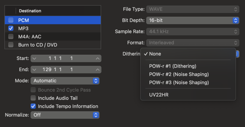 DAWでは、バウンス(書き出し)するときにディザリングの設定を行うことができます。